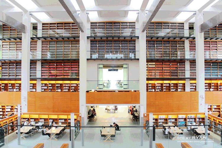 图书馆设有研讨室、书吧、咖啡厅。建筑师的设计初衷是能够让图书馆成为使用者喜欢的空间,舒适精致。2.中庭布局促进自然空气的流动,而天然光的引入健康阅读环境。图书馆四周均以绿化景观所包围。3.回旋楼梯的加入很好的融入整个图书馆的体系当中,让人感觉到一种弯曲向上的人生精神。4.竹园元素更是增添了不少传统风味。而且方便同学休息交流。